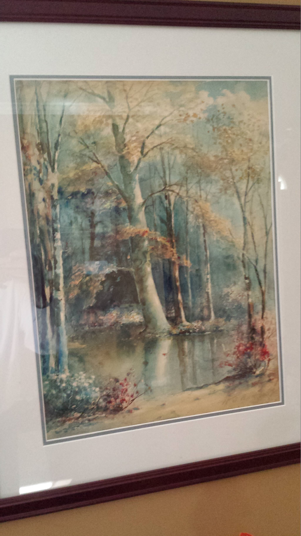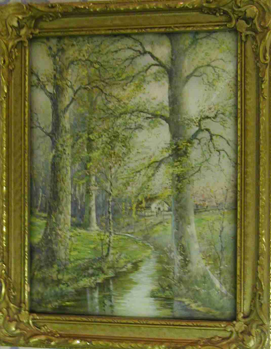 “My grandmother originally had four paintings, titled Spring, Summer, Fall, and Winter. I remember the painting of Summer being about the size of Spring which is [shown above] …and as I recall it was as a meadow with a spring running through it and cows. Fall and Winter were smaller and unfortunately I don’t remember the details. I believe they were all oil and watercolor however, I’m not positive of that either.. . The one remaining painting is a treasure to me and it is extremely unfortunate that the others were lost in the house fire where my grandmother also died July 4th weekend of 1977….[My grandmother’s family] the Fairchild family had an appreciation for his art and wanted to support that by purchasing some of his paintings. The painting is signed, however I have no idea if there is additional information under the backing. There are some tiny chips in the oil as it is under glass and I have never wanted to disturb that for fear of creating an additional problem.”