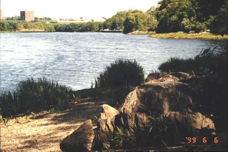 Bass Rock This photo is a view looking North from the area of Bass Rock (Click to enlarge, and also click on the drawing above of the Bucklin land to view explanations of the area shown in this photo.) The tidal river area is known as the Seekonk River. The area narrows to become the Pawtucket River as you go northward toward the Pawtucket Falls. (Above the falls, the river is known as the Blackstone River)