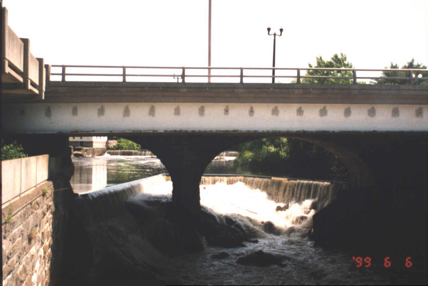Pawtucket Falls and Bridge, 1999 A 1999 view of the bridge and falls area. The bridge is the present Main Street Bridge. The grist mill of the early Bucklins stood out of the area of the photo, but on the right side of the river bank. The Bucklin fishing rocks were in this area, but now covered over by bridge materials and the places where mill factories later stood. To see where the 1747 grist mill of James Bucklin stood in relation to the bridge of that day go to our page on the Grist Mill.